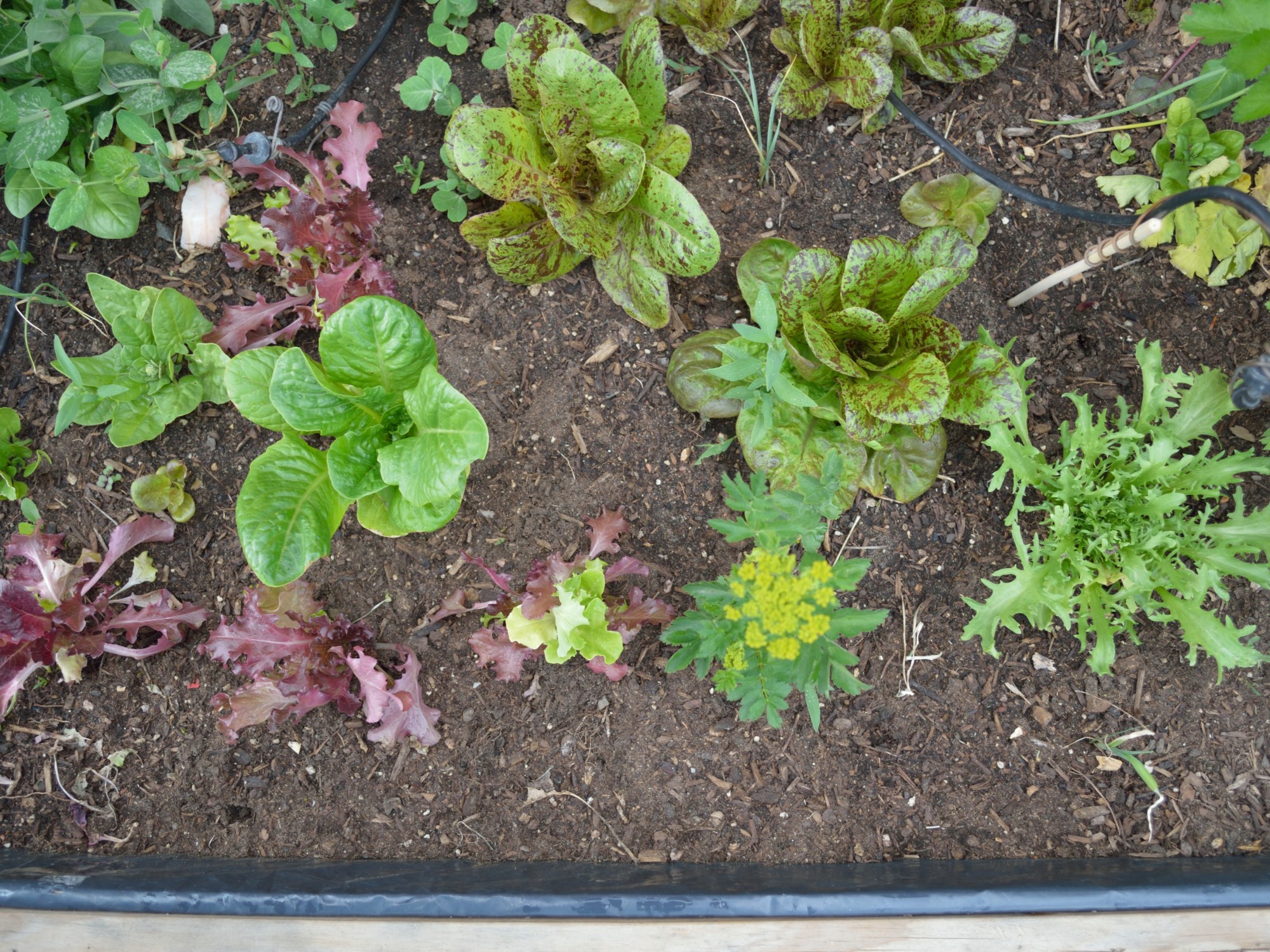 Regardless, the ditch between the golf course and the grass lands to the east of the golf course had amazing soil, with decomposing leaves from people placing there yard waste and grass clippings in the concave of the ditch. The system was naturally fertile and natures cycles created an amazingly abundant system that required very little water. The raised bed from last years recycled materials build was able to spread seed to the landscaping bed, wild lettuces migrating from the encased environment to the redwood mulch landscaping indicating a developing natural system.